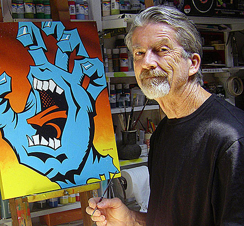 Graphic artist Jim Phillips is best known for his surf and skateboard art. Born in San Jose in 1944, Jim has been a local resident of Santa Cruz for most of his life. He was Art Director at NHS in the 1970s and 1980s where he created thousands of decks, t-shirts, stickers, product illustrations and advertisements.