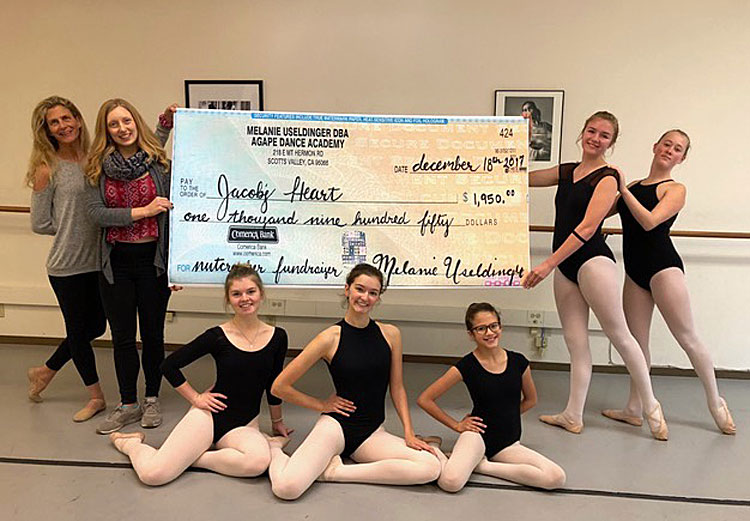 Agape Dance Academy presented a donation of $1,950 to Jacob’s Heart Children’s Cancer Services from the 2017 Nutcracker fundraiser at the Mellow Center for the Performing Arts in Watsonville.
