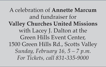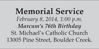 Her personal life was also extraordinary. In addition to raising her biological daughter, Marcum also was foster parent to 10 developmentally challenged children. There are three of them, now adults, which were still in her care. Rev. Bob Murrin, of Boulder Creek’s St. Michael’s Catholic Church, to which Marcum belongs, called her the “Mother Theresa of our valley.”