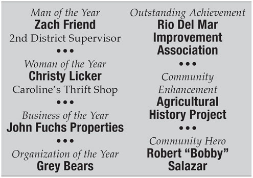 Please join our 2015 individual and organization honorees at the Aptos Chamber Annual Dinner and Awards Night on Friday, October 30th, 2015 at the Seascape Beach Resort. Call (831) 688-1467 to make reservations.