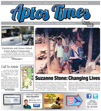Suzanne Stone: Changing Lives by Edita McQuary • Call To Artists for Seacliff Village Park • Aptos Library’s ‘Friends of’ Chapter Now Active • Santa Lives in the Wood in Aromas! by Joyce Oroz • Watsonville Wetlands Watch Docent Training Begins January 21 • Second Annual Shop With a Sheriff! • New Leaf welcomes new GM Kimberly Hallinan • Become a Volunteer Docent at Seymour Marine Discovery Center • Soquel Creek Water District News and Updates • Vandalism, Arson Unite Aptos Community by Noel Smith • SCARE Warns of Unlicensed repair Shops • Two Sides – Both Right … Both Wrong – Urinetown, The Musical Highlights Clash of Perspectives by Noel Smith • The Cobbler’s Tale – Based on a short story by Leo Tolstoy • Cabrillo Reinstates Dental Hygiene Program • 8 Tens @ Eight Short Play Festival • 2015 Santa Cruz County Fair Theme Needed! • Salesian School’s Annual Pajaro Shelter Charity Drive • Santa Cruz SPCA Appoints New Director • Farm Bureau Receives ‘County Of the Year’ Honor • ‘Check the License First’ – Prevent storm repairs from becoming costly headaches • CHP encourages Seniors to ‘Live Life to its Fullest’ • Advocacy, Inc. Welcomes New Board Members • Computer ‘Repair’ Scam Harming Locals • New Phone Scam Targets UCSC Families • Back to Basics: Gifts That Inspire the Imagination • Drowsy and Driving Do Not Mix • Distracted Driving: Is It Worth It? • Aptos High School Scoreboard • Become a CASA Advocate – Make a difference in the New Year! • Chamber Awards Dinner January 24, 2015 • The Bear Necessities – Rio Del Mar Elementary School • Memorial for Roger Botella … and much more!