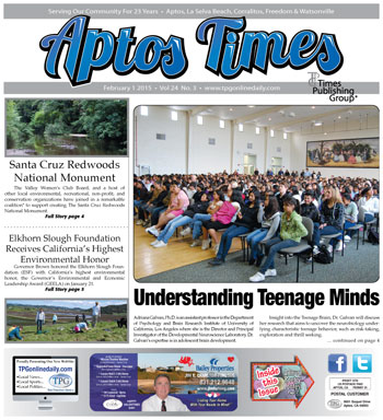 Understanding Teenage Minds • Santa Cruz Redwoods National Monument – Campaign Kick-off Thursday, Feb. 12 from 6-8 p.m. Kaiser Permanente Arena • Elkhorn Slough Foundation Receives California’s Highest Environmental Honor • Three Local Businesses Win CoolCalifornia Awards • 2015 Valentine’s Day Poetry Contest by Noel Smith • Concert to benefit PVUSD High School Scholarship Fund • Literacy Program Seeks New Tutors • Fred Keeley on Proposed Open Space District and National Monument • BLM Holds Socio-economic Workshop in Marina • Santa Cruz Symphony Family Concert • Dominican Awards Ten Local Nonprofits Over $160,000 in Funding • CYT Santa Cruz Presents Beauty and the Beast • Annual Holiday Food Drive Raises 4M Meals • Fall 2014 Ocean Steward Art Contest • Dientes Completes $3M Capital Campaign • Meet the Author at Porter Memorial Library: Karen Joy Fowler • Register now for the Sixth Annual trivia Challenge • Begonia Festival 2015 Call To Artists • World Wetlands Day 2015 – Editorial by Lou Rose, Board President, Watsonville Wetlands Watch • The AIDS Walk and Fun Run: A New Name but Same Great Fundraiser • Sheriff’s Office pledges New Detective to Gang Task Force • SCCB upgrades common stock to OTCQX marketplace • Aqui estamos/We Are Here: California Chican@ Art exhibition Cabrillo College Gallery • Big Creek Lumber Complementary Contractor College – Wednesday, February 11 at the Steinbeck Center in Salinas • Jennie Sabina Donatini • Aptos High School Scoreboard … and much more!