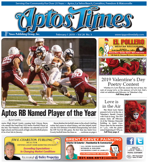 Aptos RB Named Player of the Year, By Lori Landino • Love is in the Air: Bay Shore Lyric Opera Presents a Valentine’s Benefit Concert • 2019 Valentine’s Day Poetry Contest: The Annual Times Competition for Santa Cruz County Residents • Caltrans News Flash Highlights its Use of Social Media • Lisa Jensen: Porter Memorial Library Meet The Author Series • Emergency Response Family Training • Erin Collins takes over as New Fire Marshal • Sustainable Oceans: Coral Reef Management in the Western Pacific: A Friends of the Aptos Library Free Event • Santa Cruz Civil Grand Jury Volunteers • SCC Women’s Commission Looking for 2019 Trailblazers Awards Nominations • Funding Opportunity to Address Countywide Homelessness • Academic Progress in the PVUSD • Online Tool to Improve Response to Community Service Requests • Rotary Int’l Annual Youth Speech Contest • Valentine’s Day Weddings at the County Clerk Office • Banning Cash Bail: Controversial Law Goes to Voters in November 2020 Election • Santa Cruz Announces Appointment of New Fire Chief • “Dude, Where’s My Cat?”: Santa Cruz County Animal Shelter Offering Free & Discounted Feline Services • Sip For Harvest 2019 • Rafael Castro: First Private Landowner in Aptos, By Kevin Newhouse • Pregnant Mare Rescue, By Erin Kelly-Allshouse … and much more!