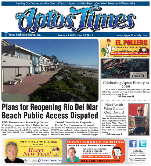Plans for Reopening Rio Del Mar Beach Public Access Disputed (RDM Homeowners Sue to Stop County Claiming Lands for Beach Drive Access • Coastal Commission Responds to Rio del Mar Homeowners Lawsuit) • TPG, Inc. Editor Noel Smith Wins Golden Quill Award, By Noel Smith (Letter to the Editor, from the Editor) • Choose Your Ride this Holiday Season • Volunteers Help Children In Foster Care • CDFW Awards $4.2 Million for Greenhouse Gas Reduction Grant Projects • New California Laws Coming 2019: Women on the Board, Cannabis Events, Street Vending • Foundation Provides New Pediatric Gym, By Aric Sleeper • County to Open New Safety Center in Aptos • PVUSD Board Welcomes New Staff • Introductory session in the Art of Communication • WomenCARE PSA for Cancer Support Group • Santa Cruz County Highest Voter Turnout • Enroll Now for Jan. 5 Smart Driver Class • Women’s Adventure Film Tour at the Rio • Remembering Kay Metz • Possible Tax Relief for Domestic Parters • Be A Holiday Hero – Give The Gift Of Life; Red Cross urgently needs blood and platelet donations • RTC Receives Highway Safety Improvement Grant for Highway 9 Pedestrian Crossings • Ticks and Tick-Borne Diseases • At Your Service; Fast Facts About Service Dogs • Ten Doctor-Recommended New Year’s Resolutions • Leadership Santa Cruz County Launches Search for New Executive Director • Celebrating Aptos History in 2019!, By Kevin Newhouse • Five tips for coping with Chronic Pain • Take Steps Toward a Healthier Lifestyle • Fatima’s Fine Jewelry … and much more!