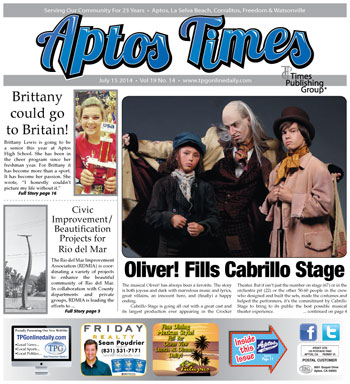 Oliver! Fills Cabrillo Stage by Noel Smith • Adoption Specials on All Animals at Santa Cruz Animal Shelter • Civic Improvement and Beautification Projects for Rio del Mar Area • Tandy Beal & Company ‘Creative California Communities’ Receives Grant • CASA changes lives • Erik’s Delicafé Gives Back To Help Local Food Banks this July • Student Showcase: 2014 Arts Workshop at Cabrillo College By Edita McQuary • 2nd Annual Berries & Bottles Winery Showcase • A Day on the Beach: Cleaning Up with Lions, Leos and Marine Life by Kevin Newhouse • Congratulations to our 2014 Parade Winners! • New Board Members Elected To Visitors Council • Families Encouraged to Explore Wild Places • Brittany could go to Britain! • John Babcock: Santa Cruz County 2014 Artist of the Year • John E. Eiskamp selected 2014 ‘Farmer of the Year’ By the Santa Cruz County Farm Bureau • Pre-trip Vehicle Check Can Make The Difference • Legislature Approves Bill to Improve Coastal Commission Transparency • Fraudulent Callers Target Personal Medical Information • Kenneth Lyford: 1954 ~ 2014 • Employee engagement – The secret for small businesses to stay productive and make money • More Summer Hardware for Aptos Little League By Aidan Mathews … and much more!