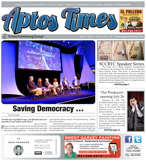 Saving Democracy … by Noel Smith • SCCRTC Speaker Series • Soquel Pioneer & Historical Association Picnic • Monterey Bay Regatta for BBBS • AARP Smart Driver Classes • Food Truck Taco Tuesday at Anna Jean Cummings Park • Rio Del Mar Esplanade Concessions • Watsonville Wetlands Watch – Honoring Jim Van Houten • Red Cross Celebrates Tri-County Volunteers • ‘The Producers’ opening July 26 at Cabrillo Stage, by Mindy Pedlar • Pets Who Give • Cabrillo College’s Statewide Recognition • Dominican Offers County’s First Robotic Surgery • Candidate Filing for Nov. Election Begins, by Gail L. Pellerin • Grey Bears Makes First Recycled Polystyrene Shipment • Aptos 4th of July ‘World’s Shortest Parade’ 2018 • Sow & Grow Fall Feast • Report Highlights Workforce Challenges • Mid–County Residents Invited to Discuss Future of Water • 2017 California Criminal Justice Data Released • Santa Cruz County Sheriff’s Advisory Team Recruitment • SCCOE Appoints Jivan Dhaliwal • Aptos Majors Wins District 39 • Camping Helps Develop Strong Kids, by Ethan Schafer • Saving Democracy,