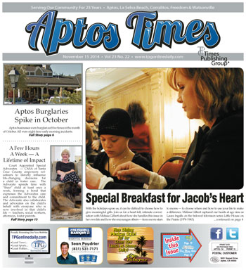 Special Breakfast for Jacob’s Heart by Lori Butterworth • Make a Difference in Your Community! Aptos Adopt-A-Family –21 years of providing for families in times of hardship • Aptos Burglaries Spike in October • CPUC to Consider Dismissal of Power Line Project • National Poet, Journalist Visits Watsonville • Focus Agriculture’s Twenty-Fifth Class Graduates • Innovative treatment Exceeds State Regs • Dominican Hospital Receives Another “A” Grade for Hospital Safety • Hospice of Santa Cruz County Grief Group • ‘Fill the Barrels’ For Our Local Food Bank at Santa Cruz County Bank • Third Annual Holiday Lighthouse Lighting Benefit for O’Neill Sea Odyssey • Interview With CASA Advocate Anne Young by Tim Davis • 100 Reasons To Celebrate • Book Talk on Navaho Textiles • Home Sponsors Welcome Habitat Partner Family • Celebrating 25 Years – Focus Agriculture’s 18th Annual Progressive Dinner was a success! • Watsonville Native Serves With VAQ-132 • Mountain Lion Struck and Killed on 17 • SPCA Program Focuses on Next Generation – Compassion for Animals Reaches Over 5,000 Santa Cruz County Students Per Year • My Three Angels … a Play in Two Acts • Aptos Native’s Two Children, Husband Killed in Apparent Murder-Suicide in Reno • Internet Crime Complaint Centers (IC3) Scam Alerts – E-Z Pass Spam Campaign • Photography in the Library Exhibit • Aptos Cross County’s Winning Season • Aptos High School Hires New Lacrosse Coach • Aptos High School Scoreboard • Safe at Home Senior Care – Providing the Highest Quality In-Home Care by Maggie Caldwell • Blue Moon Clothing Co. Aptos – Quality, Comfort, and Style by Maggie Caldwell … and much more!