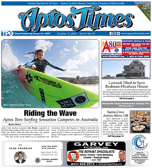 Riding the Wave: Aptos Teen Surfing Sensation Competes in Australia, By Jon Chown • Lawsuit Filed to Save Redman-Hirahara House: Seeks Halt to Demolition of Historic Home and its Story, By Jon Chown • PVUSD Board, Teachers Discuss Money, Budgets: Instructors To Receive Stipend for New Literacy Program, By Jon Chown • Watsonville City Council Passes Homelessness Strategic Plan • EPA Oversees Extensive Battery Removal at Moss Landing After 2025 Fire • Santa Cruz Artists Show Off: Open Studios Tour Offers Opportunity for Exposure, By Jon Chown • Infected Mosquito Found in County Again: Detection in Boulder Creek of Dengue-Transmitter Prompts Call for Precautions • County Releases Draft of Hazard Mitigation Plan for Review • Dig Gardens Marks 20th Anniversary • Lost Dog Gretchen Safely Recovered After 11 Days Thanks to Community Efforts • Peninsula Open Space Trust Acquires 668 Acres in Upper Pajaro River Valley: Conservation Group Aims to Link Agriculture and Restoration to Boost Climate Resilience, By Jon Chown • Coburn to Become County’s Next Executive Officer • 2024 Was A Good Year for Ag Industry: Santa Cruz County Crop Report Shows Bounce Back From Slow 2023, By Jon Chown • New Leaf Opens New Market on River Street • Soquel Creek Water District Honored by WateReuse • Watsonville Police Launch Pink Patrol Car for Awareness • Watsonville Police Step Up Pedestrian Safety Efforts • Highway 1 Work to Begin at Waddell Bluffs • County Issues Order Requiring Masks in Acute Care Facilities • MAH 5-Minute Film Fest Open to Submissions • Santa Cruz Mid-County Groundwater Agency Seeks Private Well Owners for Board • Francisco ‘Fran’ Jimenez: Dec. 17, 1946 ~ Sept. 16, 2025 • Voters Warned To Mail Ballots Early: Postmark Might Be Placed Days After You Mail It • California’s School Report Cards (SARC) Highlight Problems at PVUSD • Aptos Volleyball Shows Growth in Tight League Battles … and much more!