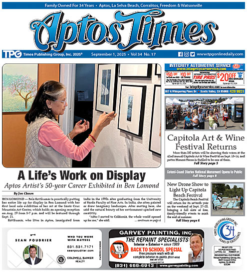A Life’s Work on Display: Aptos Artist’s 50-year Career Exhibited in Ben Lomond, By Jon Chown • Santa Cruz to Hold Daylong Vigil Honoring Children Killed in Gaza • Capitola Art & Wine Festival Returns, By Jon Chown • New Drone Show to Light Up Capitola Beach Festival: Event Promises a Weekend Packed with Fun • PVUSD Changes Date of December Board Meeting After Contentious Debate, By Jon Chown • Cotoni-Coast Dairies Now Open to the Public • Supervisors OK New Sheriff Substation in Davenport • Monterey Car Week Festival Wraps Up • BESS Meetings End; Community Concerned: New Regulations Said to be in Place to Prevent Moss-Landing Type Fire, By Jon Chown • County Receives Nearly $14 million in Road Funding • Santa Cruz County Approves New Rules for Abandoned and Oversized Vehicles, By Jon Chown • Joby Aviation Air Taxi Completes Landmark Flight • County Makes Changes for Short-Term Rentals: Ordinance Aims to Reduce Purchases by Corporations and LLCs, By Jon Chown • Surf History Exhibit Coming to Live Oak • New Leaf Community Markets to Open New River Street Store Sept. 27 • RMSD Medical Reopens in Capitola Village • Elkhorn Forever Campaign Declares Success • Author Meg Waite Clayton to Speak at Capitola Library • Community Invited to Presentation on Beach Resilience • Improvements at Miller Property County Park Celebrated • Comedians Clara Bijl, Scott Capurro to Perform in Santa Cruz • Cabrillo College Shines in New Rankings • Chipotle Opens First Scotts Valley Location • HelloFresh to Pay $7.5 Million Over Auto-Renewal Violations • UC Master Gardeners Open Applications for 2026 Training Program • Santa Cruz County High School Football Season Kicks Off • California’s Budget Decisions Are Failing Its Most Vulnerable Children • Fun to Read About Capitola Junior Guards in Competition … and much more!