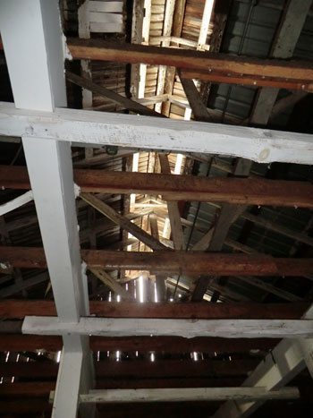 Some of the features found during preservation were: roof vents for air circulation and cooling (No AC!), a balance scale at one of the entrances (for weighing apples possibly?) metal printing plates from the 1920’s for a local newspaper that were used as roofing material, and wooden floors which will be preserved for the new grocery store.