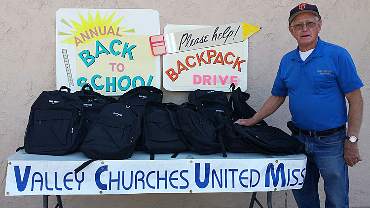 The annual Valley Churches Back to School Program is well under way. The backpack program provides backpacks and school supplies to low-income kids in San Lorenzo Valley, Scotts Valley and Bonny Doon. Each $40 cash donation will provide a student with a backpack full of grade appropriate supplies.