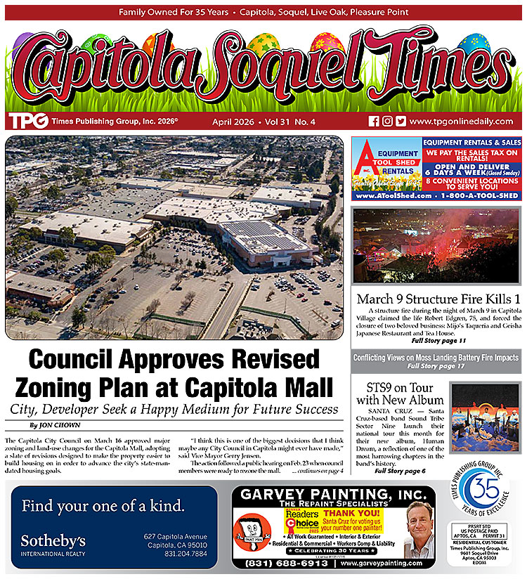 Council Approves Revised Zoning Plan at Capitola Mall: City, Developer Seek a Happy Medium for Future Success, By Jon Chown • County Expands Free Well Water Testing Program to Include Additional Contaminants • STS9 on Tour With New Album: Legendary Santa Cruz Band Has One Show in California, By Jon Chown • County Mum on Details of Fire Station Arson: County Records Show Surveillance Cameras Should Have Captured the Act, By Jon Chown • The Magic of Community in Capitola, By Teresa Green • County Seeks State Clarification on Housing Compliance Date: Issue is Central to Builder’s Remedy Disputes, By Jon Chown • A True Friend of Agriculture: CEO of Community Foundation Honored by Local Ag Leaders • March 9 Capitola Structure Fire Kills 1, By Jon Chown • New Batting Cages Unveiled at Anna Jean Cummings County Park in Soquel • Scientists Present Conflicting Views on Moss Landing Battery Fire Impacts: County to Ask Vistra to Fund Ongoing Independent Monitoring of Pollution, Story and Photos By Jon Chown • Renata Bratt Bridges Musical Worlds: Performances in Boulder Creek, Aptos Coming Up, By Jon Chown • Santa Cruz County Announces $810,000 in Opioid Settlement Grants • New Exhibit Tells the Stories Behind Capitola’s Structures • Water District Completes Moosehead Drive Improvements • South County Property Tax Error Confuses Homeowners, By Claudia Iseman • Watsonville Hospital Struggling Despite Tax Infusion • Leadership Santa Cruz County Accepting Applications • Scholarships Offered for Private Music Lessons • Civics Summit at Cabrillo College Teaches Teens About Elections, Democracy, By Claudia Iseman Mid-County Senior Center: A Thriving Hub for Social, Recreational, and Educational Activities • MusicalMe Inc.: Every Child — and Parent — Benefits from Music Education … and much more!