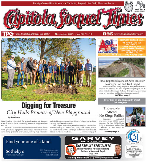 Digging for Treasure: City Hails Promise of New Playground, By Jon Chown • Final Report Released on Zero-Emission Passenger Rail and Trail Project, By Jon Chown • Housing Matters Showcases Progress on Harvey West Studios in Santa Cruz • Welcome to Capitola! • Thousands Attend No Kings Rallies: Protests in Santa Cruz, Watsonville Mostly Jovial, By Jon Chown • Prepare for Lift Off!: Advanced Air Mobility to Power Local Economy, By Jon Chown • Arrest Made in Alleged Road Rage Incident, By Jon Chown • County Releases Final Report on Aging Plan: Survey Highlights Strengths, Challenges, and Next Steps for Aging Well in Santa Cruz County, By Jon Chown • Councilmember and Resident End Dispute: Orbach and Magquire Apologize to Each Other, By Jon Chown • Aptos Chamber Celebrates Holiday Season with Tree Lighting & Makers Market • New County Program to Alert Property Owners to Fraud • Housing Matters to End Day Services Program • New Principal Appointed at Soquel Elementary • Driver Dies as Van Plunges Off Wharf: Local Outrigger Club Saves Dog During Practice Paddle, By Jon Chown • California State Parks Offers Free Veterans Day Admission to Military Families • Community Bridges WIC Remains Open During Potential Federal Government Shutdown • Ribbon Cutting for New Brighton’s New Track on Nov. 6 • Santa Cruz Symphony to Perform ‘The Planets’ at Civic and Mello • 42nd Annual Wine & Roses Fundraiser Returns to Watsonville • Capitola Beach Festival Brings Joy, Community, and Visitors to the Village • State Parks Launches Multimedia Exhibit at Santa Cruz Mission • Council Opts for Caution on Pathway: Authorizes $20,000 to Study Erosion Issue Before Big Spend, By Jon Chown • Campo Del Mar Porcelain: A Colorful Capitola History, By Deborah Osterberg • Is ZEPRT Project Unfeasible? … and much more!