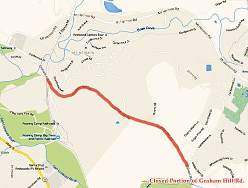Graham Hill Road will be closed between Roaring Camp Road and Lockewood Lane Wednesday and Thursday, Oct. 7 and 8, from 8:30 a.m. to 4:30 p.m. A detour will reroute motorists onto Lockewood Lane and Mt Hermon Road. Motorists traveling between San Lorenzo Valley and Santa Cruz also can take Highway 9, which has reopened after several months of road construction.