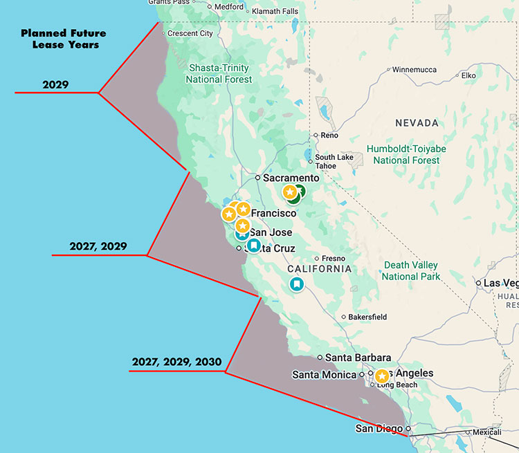 The federal proposal outlines three lease sales off Southern California in 2027, 2029 and 2030; two off Central California in 2027 and 2029; and one sale off Northern California in 2029. The agency must now open a 60-day public comment period before the plan can be finalized.