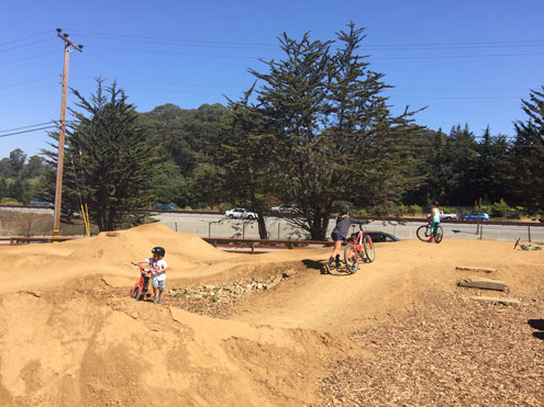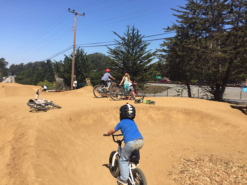 A new bicycle pump track opened in mid-August at McGregor Park in Capitola. The pump track is part of a popular multi-use park with a skate feature and dog park. A pump track is a continuous loop of dirt berms that allow riders to travel the entire length without peddling — just “pumping” their bike to keep moving. Since pump tracks don’t have formal jumps, it allows for riders of all skill levels and ages to use the park. The approximately 7,000 sq. ft. park was built by Alex Fowler and Action Sports Construction, a local firm with experience building and maintaining bike parks worldwide. Action Sports Construction is based in Aptos and has played a role in several local bicycle parks, including the jumps at the Polo Fields (more details below).
