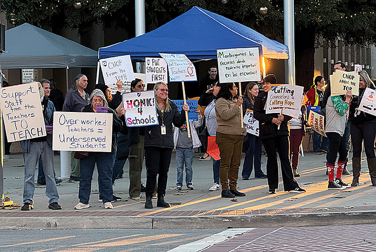 Teachers protest in front of the Watsonville Public Library over the Pajaro Valley Unified School District Board of Supervisors’ vote to cut jobs ahead of that evening’s meeting.