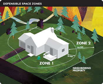 This concept of laddering fuels is what the principle of “Defensible Space” is based on. We ask you to provide a defensible space of 100 feet around your home if possible. We ask you to keep the grass mowed, remove easily ignited fuels, provide space around shrubs and bushes, and remove the lower limbs of trees to reduce the likelihood of setting fire to the tree’s crown.