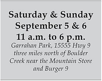 Enjoy the last days of summer with family, friends, and community at the second annual Santa Cruz Mountain Art, Wine, and Music Festival at Boulder Creek’s Garrahan Park. Showcasing local artists and musicians, the Boulder Creek Brewery and mountain wineries will be pouring. Expect great food and drink, groovin’ times in the sunshine; face painting, a jumpy house and other activities for the kids. More to be announced!
