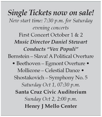 Single Tickets: Single tickets ($27-$75) go on sale through Santa Cruz Tickets beginning at noon on September 6. They are available through the Civic Box Office at 420-5363 or online at SantaCruzTickets.com.