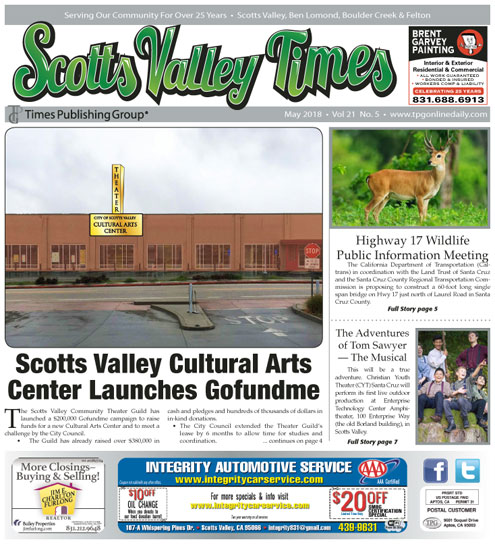Scotts Valley Cultural Arts Center Launches Gofundme • Habitat Connectivity Project • SLVWD Replacing Leaking Water Tank • The Adventures of Tom Sawyer: The Musical • Eleventh Annual Music in May: at Cabrillo College’s Samper Recital Hall • Hospice of SC Honors Volunteers Disco-style! • VCUM Bucks For Hunger