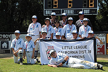 The District 39 Champions’ roster started out as 12 players now is 10. Two of Aptos’ top performers had left for summer vacation. The remaining 10 players put on a heroic effort and were ultimately eliminated from the Section 5 Championships, but not before scoring 20 runs over 3 games including a 10 – 1 victory over District 59 Champions, Gilroy.