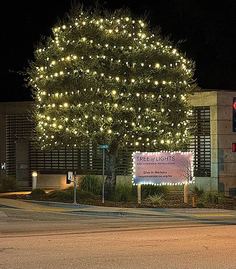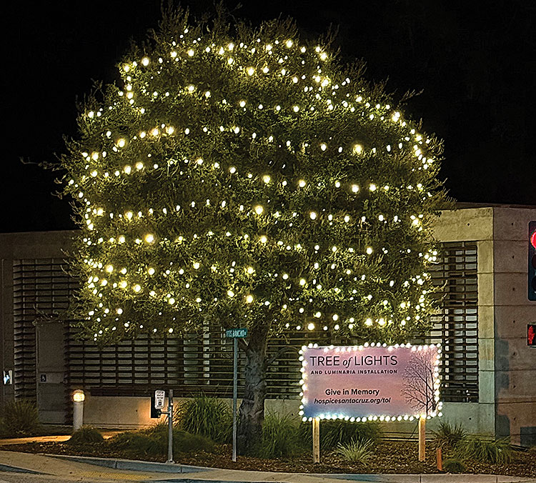 In front of Community Foundation Santa Cruz County at the corner of Soquel Drive and Aptos Rancho Road sits the Tree of Life, a memorial by Hospice of Santa Cruz County, brightening the road for shoppers and travelers this holiday season.