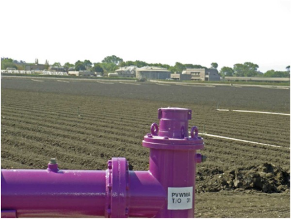 Caption: Purple pipe delivering blended recycled water from the Watsonville Recycled Facility to coastal agricultural lands; the treatment facility funded by the grant is visible in the background.